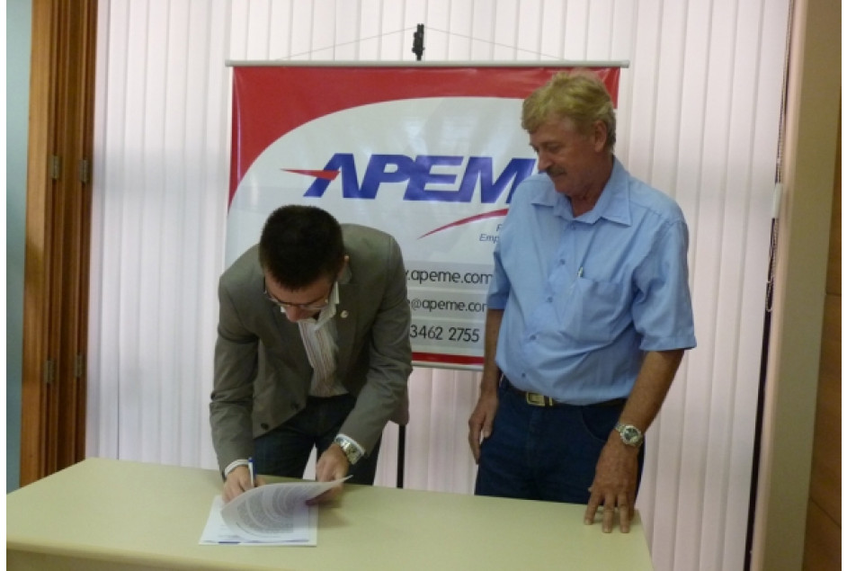 A diretoria da Gestão 2011/2013 deu um importante passo na história da entidade: a compra de uma nova sede. Na tarde de terça-feira, 5 de março, o presidente da APEME, Leonir Nicaretta, realizou a assinatura oficial do contrato de compra com o construtor Fortunato Agostini, da Real Nobre Construções, tendo por local a sede atual da APEME. Prestigiaram o evento o vice-presidente Gilberto Pedrucci, o presidente eleito para a próxima gestão, Luciano Frübel, sua vice Edriane Giovanaz, a imprensa local, colaboradores e parceiros envolvidos na obra.