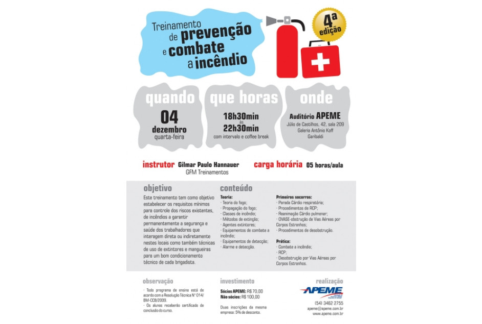 A APEME – Associação de Pequenas e Médias Empresas de Garibaldi, promove no dia 4 de dezembro, quarta-feira, treinamento de prevenção e combate a incêndio. Esta será a quarta edição. Será das 18h30min às 22h30min, com intervalo e coffee break, no auditório da APEME.