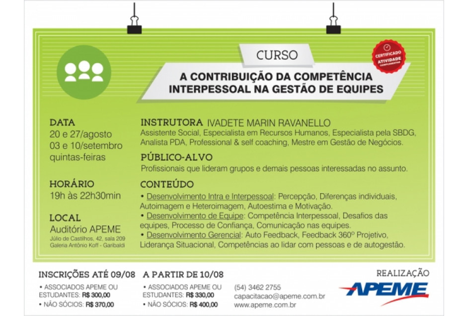 Para inscrições antecipadas, até dia 9 de agosto, o investimento é diferenciado. Associados e estudantes pagam R$ 300; não sócios, R$ 370. Para inscrições a partir de 10/08, associados e estudantes pagam R$ 330 e não sócios R$ 400. Informações e inscrições pelo fone (54) 3462-2755 ou capacitacao@apeme.com.br.